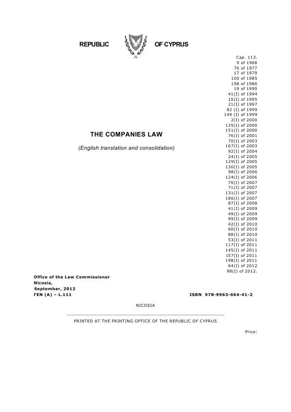 Перевод закона Кипра о компаниях – «Компании, пункт 113, с поправками». Объем перевода 327 страниц.