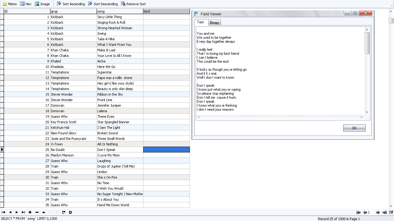 База данных текстов самых популярных русских и зарубежных песен в MySQL, состоящая из 152605 песен. Размер базы данных 200 мб.