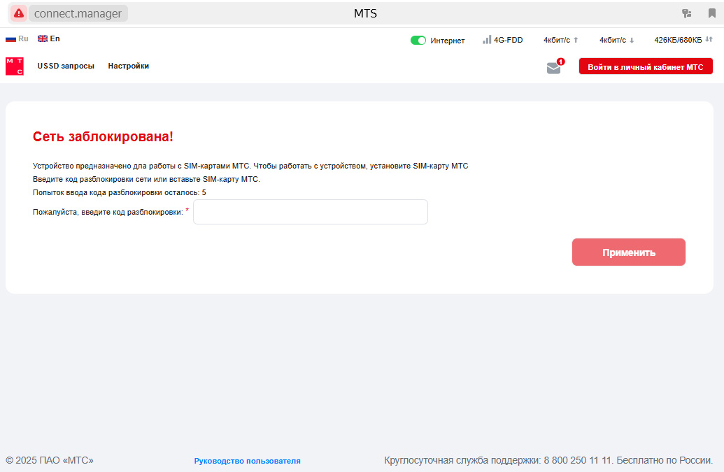 После ввода полученного кода разблокировки в веб-интерфейсе роутера - он начинает работать с SIM картами любых операторов.