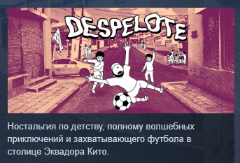 despelote — игра про футбол и людей. Взгляните на улочки и парки Кито глазами восьмилетнего мальчика Хулиана. Ведите мяч, обводите препятствия и забивайте голы, бегая по городу и передавая пас прохожим — посмотрите на их реакцию. Наблюдайте за переменами в городе, пока Эквадор готовится к Чемпионату мира.