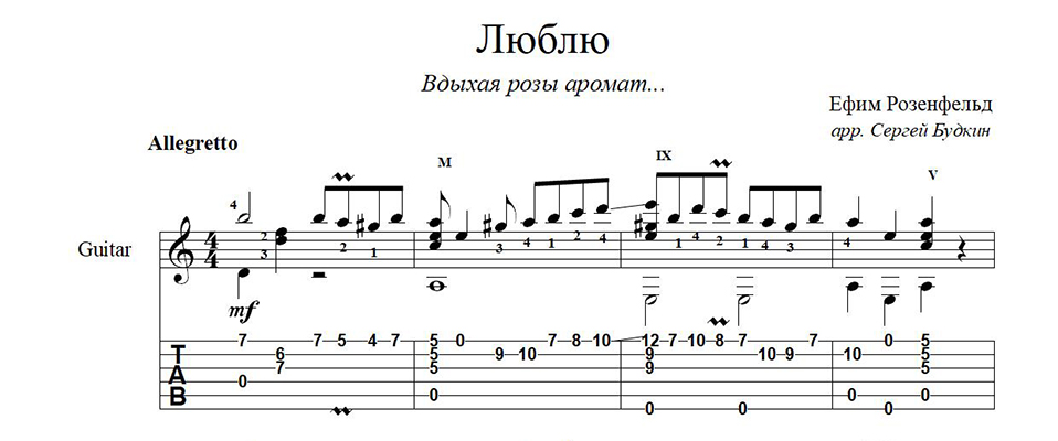 Аранжировка для гитары популярного в своё время танго Ефима Розенфельда "Люблю (Вдыхая розы аромат...)"