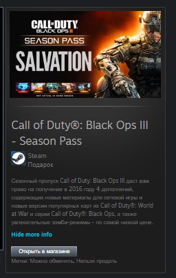 Сезонный пропуск Call of Duty: Black Ops III даст вам право на получение в 2016 году 4 дополнений, содержащих новые материалы для сетевой игры и новые версии популярных карт из Call of Duty®: World at War и серии Call of Duty®: Black Ops, а также увлекательные зомби-режимы.