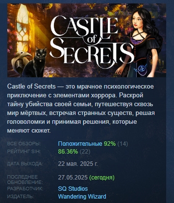 Castle of Secrets — это мрачное психологическое приключение с элементами хоррора. Раскрой тайну убийства своей семьи, путешествуя сквозь мир мёртвых, встречая странных существ, решая головоломки и принимая решения, которые меняют сюжет.