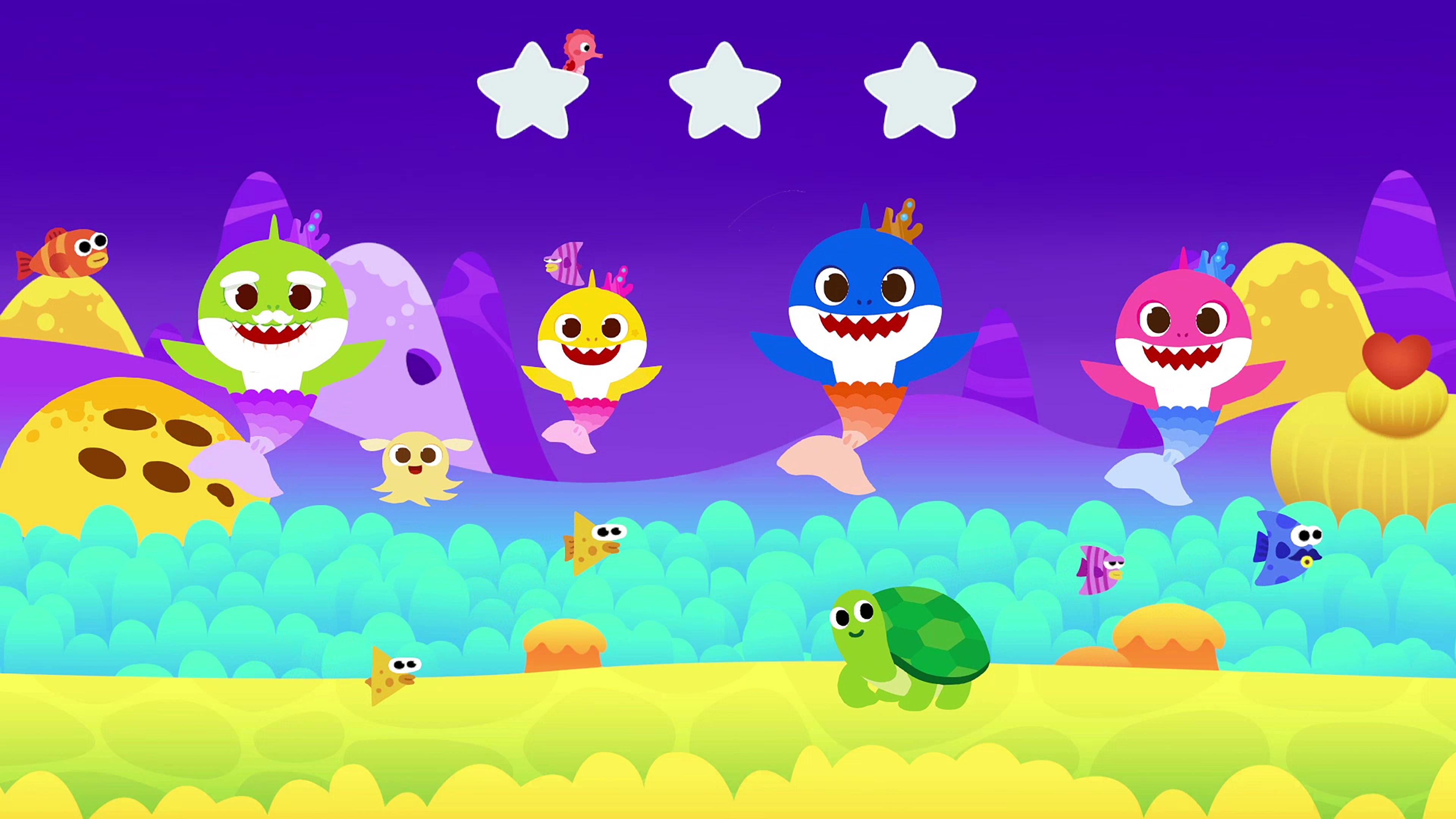 Отправляйтесь на фантастический фестиваль вместе с семьей акул. Пойте и плавайте под не-зуб-ываемые песни и получайте в награду музыкальные карточки для своего альбома.