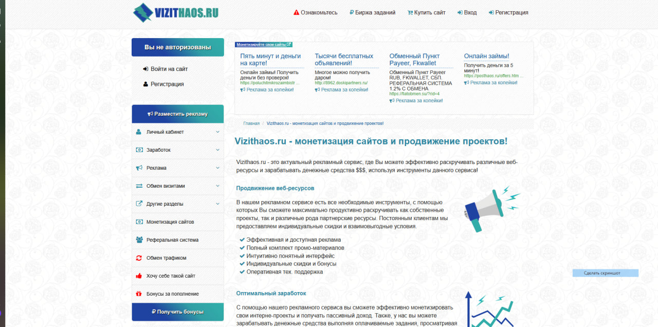 Vizithaos.ru - это актуальный рекламный сервис, где Вы можете эффективно раскручивать различные веб-ресурсы и зарабатывать денежные средства $$$, используя инструменты данного сервиса!