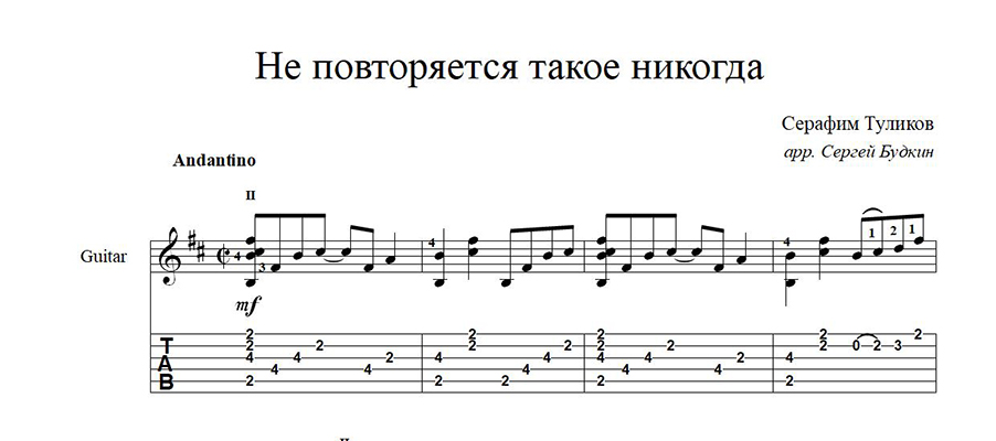 Аранжировка для гитары песни Серафима Туликова "Не повторяется такое никогда". Исполняли ВИА "Пламя", "Самоцветы" и многие другие.