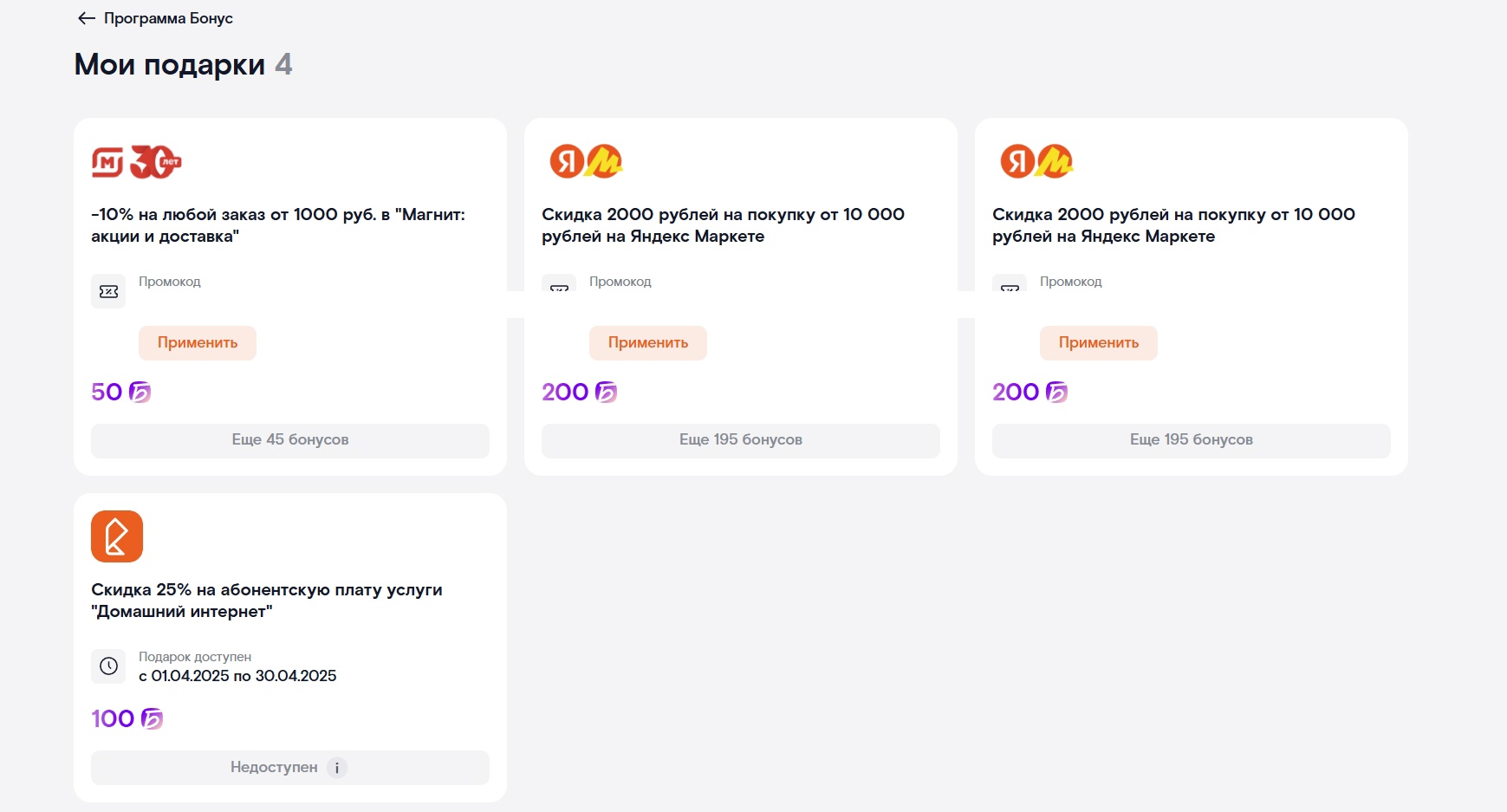 ✔ Другие подарки – скидки на Т2, Яндекс.Плюс, абонплату и многое другое