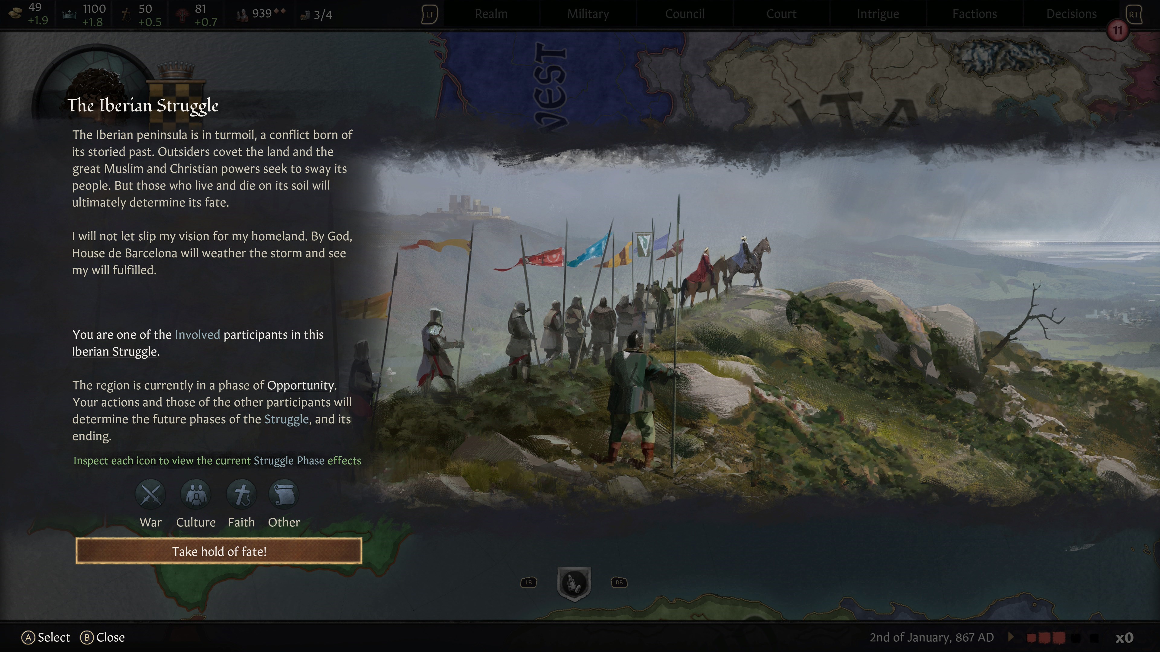 На протяжении веков вашим персонажам придется корректировать стратегию и планировать новые нападения, пока конкуренты тоже пытаются объединить Иберию под единой властью и верой. Если вы предпочитаете мирные способы, предложите компромисс: оставить богатые земли в покое, но разделить их между мелкими правителями. Как велики ваши амбиции?