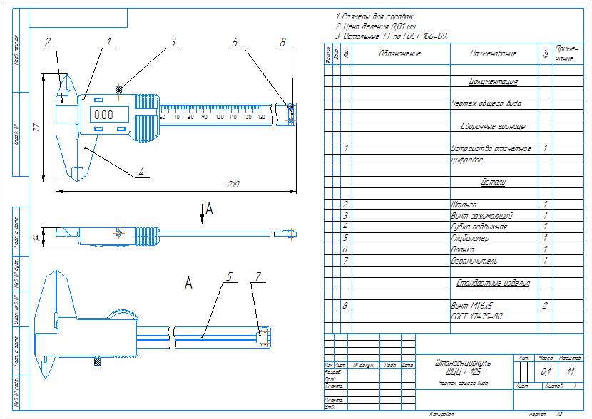 Чертеж цифрового штангенциркуля ШЦЦ-I-125 в программе компас