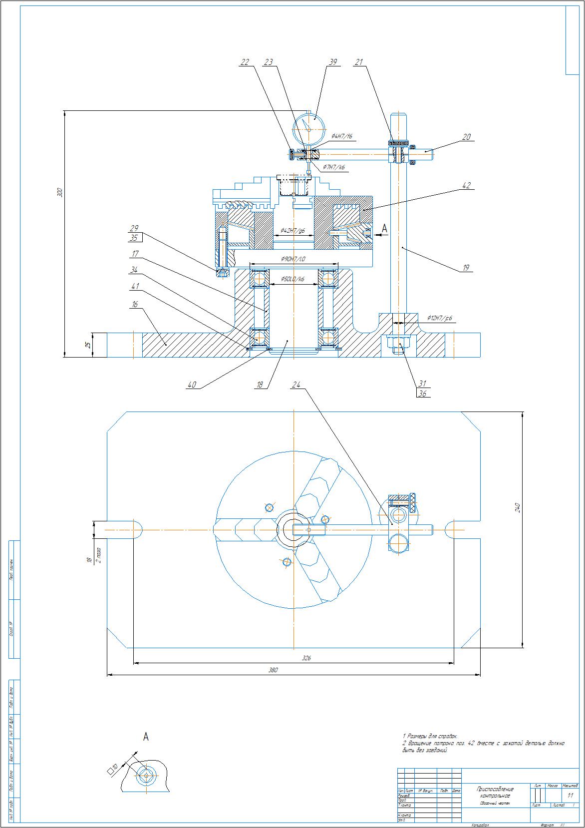 Сборочный чертеж и спецификация контрольного приспособления для контроля торцового биения в детали втулка
