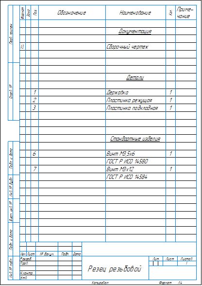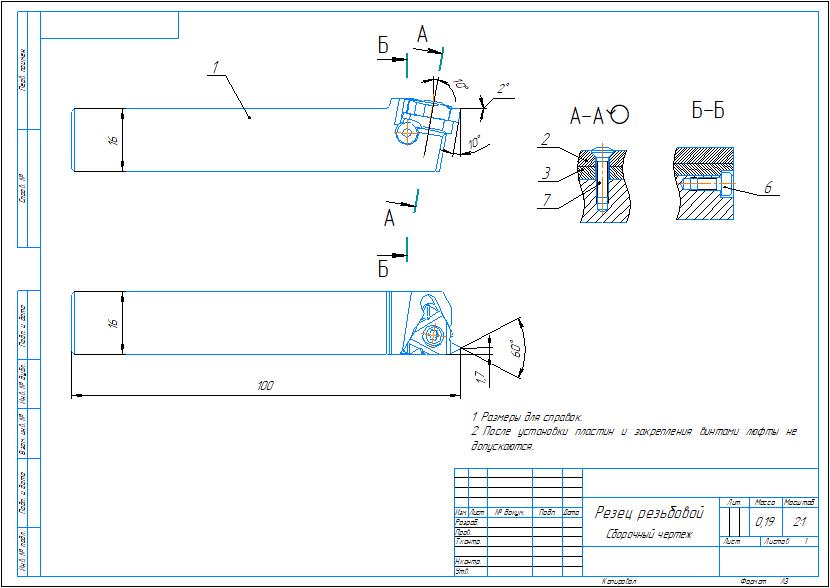 Сборочный чертеж и спецификация токарного резьбового резца для точения наружной резьбы в программе компас