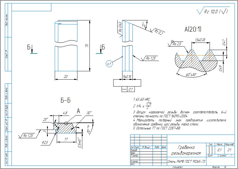 Рабочий чертеж гребенки резьбонарезной в программе Компас-3D