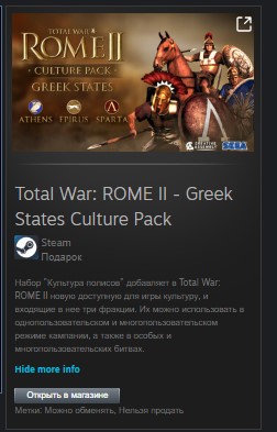 Набор "Культура полисов" добавляет в Total War: ROME II новую доступную для игры культуру, и входящие в нее три фракции. Их можно использовать в однопользовательском и многопользовательском режиме кампании, а также в особых и многопользовательских битвах.
