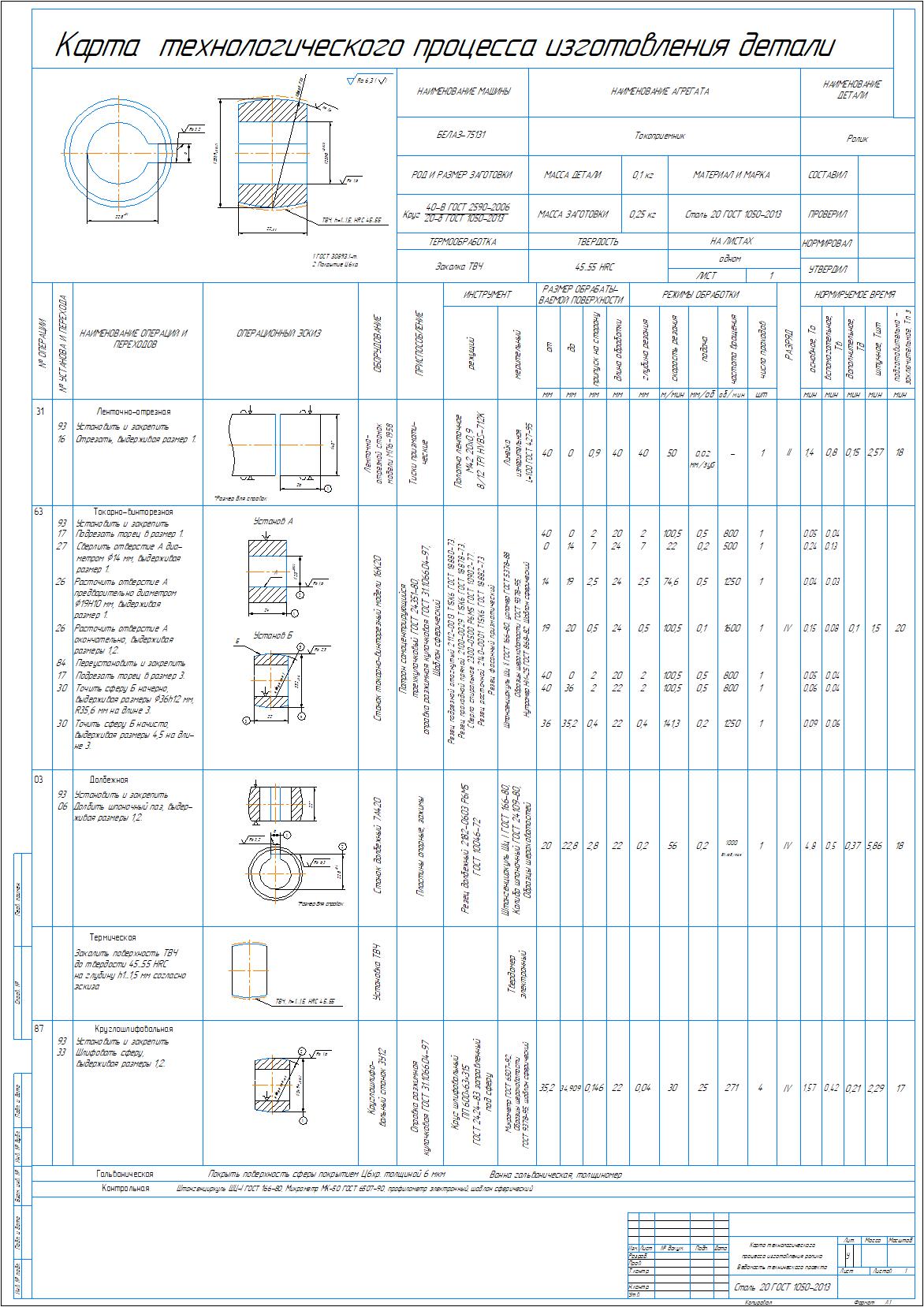 Карта технологического процесса изготовления ролика в виде чертежа на формате А1. Ролик применяется в узле токоприемника автомобиля БелАЗ. Также приложена 3D модель ролика. Чертеж и модель выполнены в программе компас