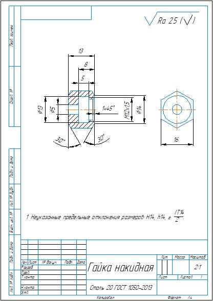 Рабочий чертеж детали гайка накидная, выполненный в программе компас