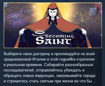 Выберите свою доктрину и проповедуйте по всей средневековой Италии в этой roguelike-стратегии в реальном времени. Собирайте разнообразных последователей, отправляйтесь убеждать и обращать новых верующих, завоевывайте города и стремитесь стать святым при жизни во что бы то ни стало.