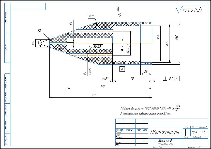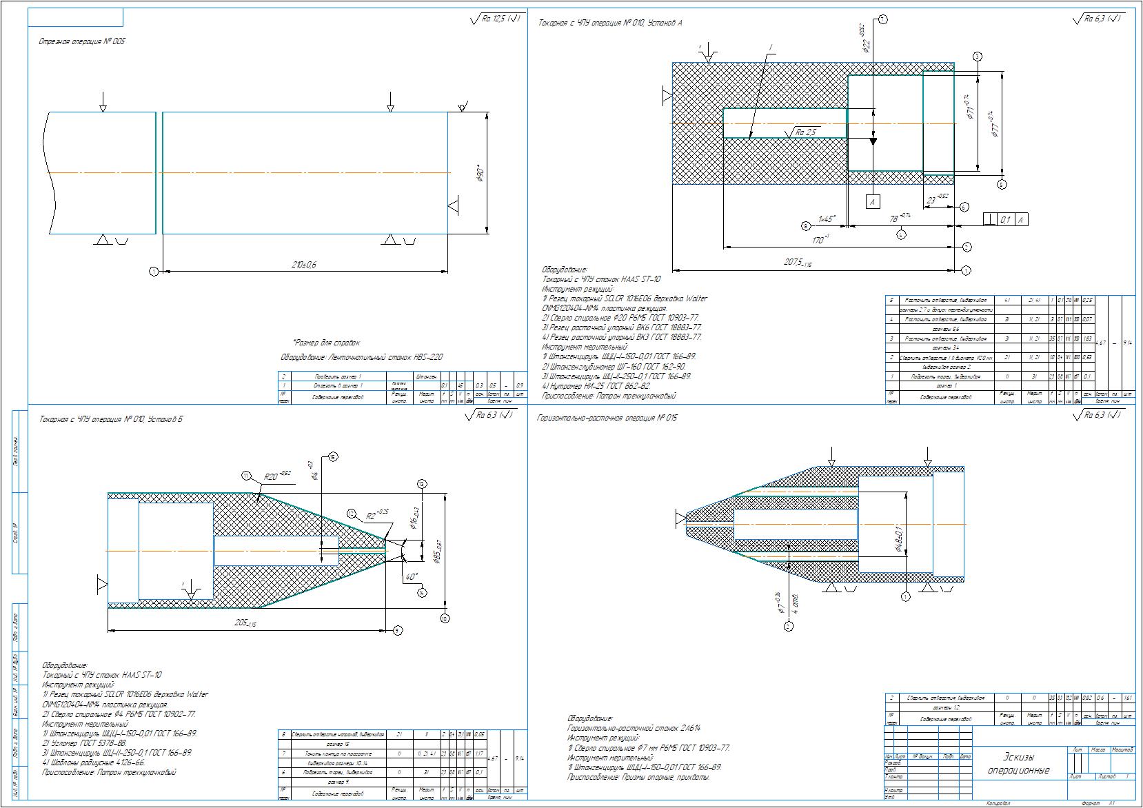 Эскизы операционные изготовления детали обтекатель в виде плаката на формате А1. Также подобрано оборудование, режущий инструмент, режимы резания. Также приложен рабочий чертеж детали. Чертежи выполнены в компасе.