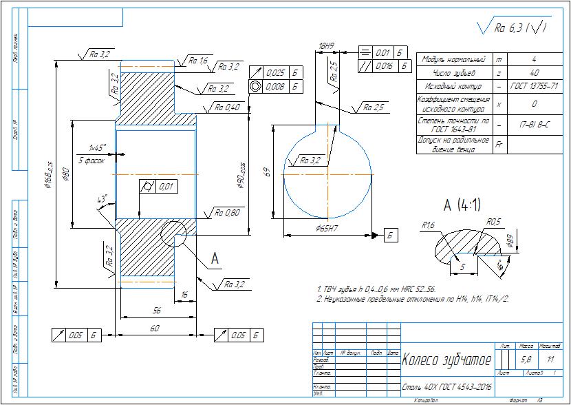 Рабочий чертеж детали колесо зубчатое с параметрами: модуль m=4 мм, число зубьев z=40 шт. Чертеж выполнен в компасе.