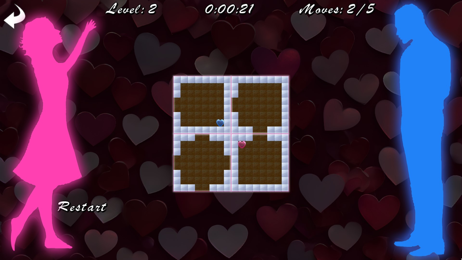 In this puzzle you need to swap the tiles to indirectly control the hearts that move towards each other until blocked by a wall.