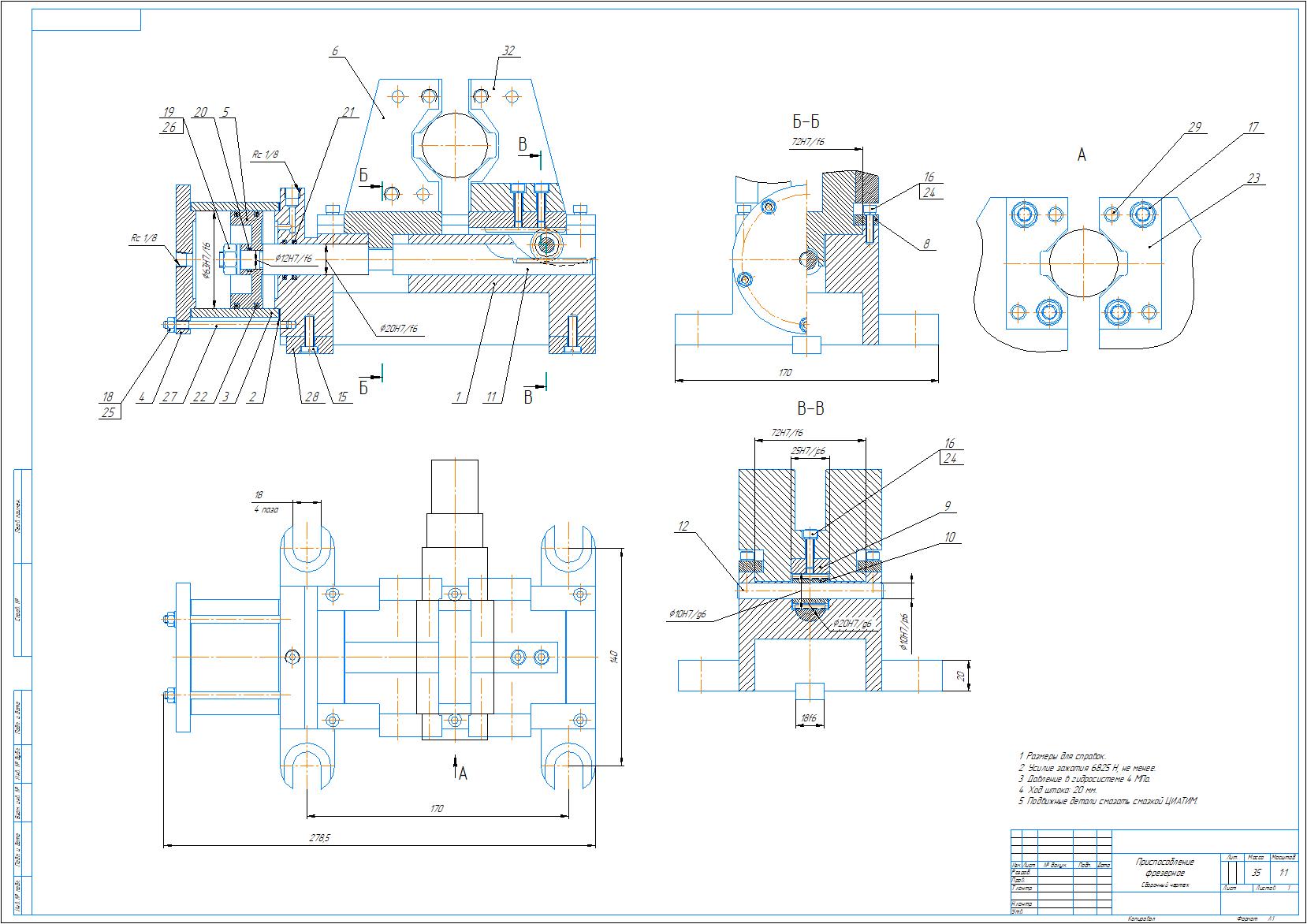 Сборочный чертеж и спецификация фрезерно-центровального приспособления для обработки детали вал. Также приложен рабочий чертеж и 3д-модель детали вал. Чертежи, спецификация и модель выполнены в компасе. Приспособление с пневмоприводом, самоцентрирующее.