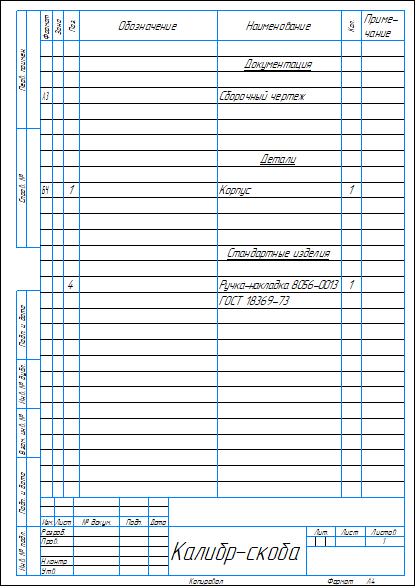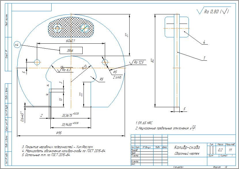 Сборочный чертеж и спецификация на калибр-скобу гладкую для контроля размера 34h14 мм. Также приведен расчет предельных размеров скобы в ворде. Чертеж и спецификация выполнены в компасе.