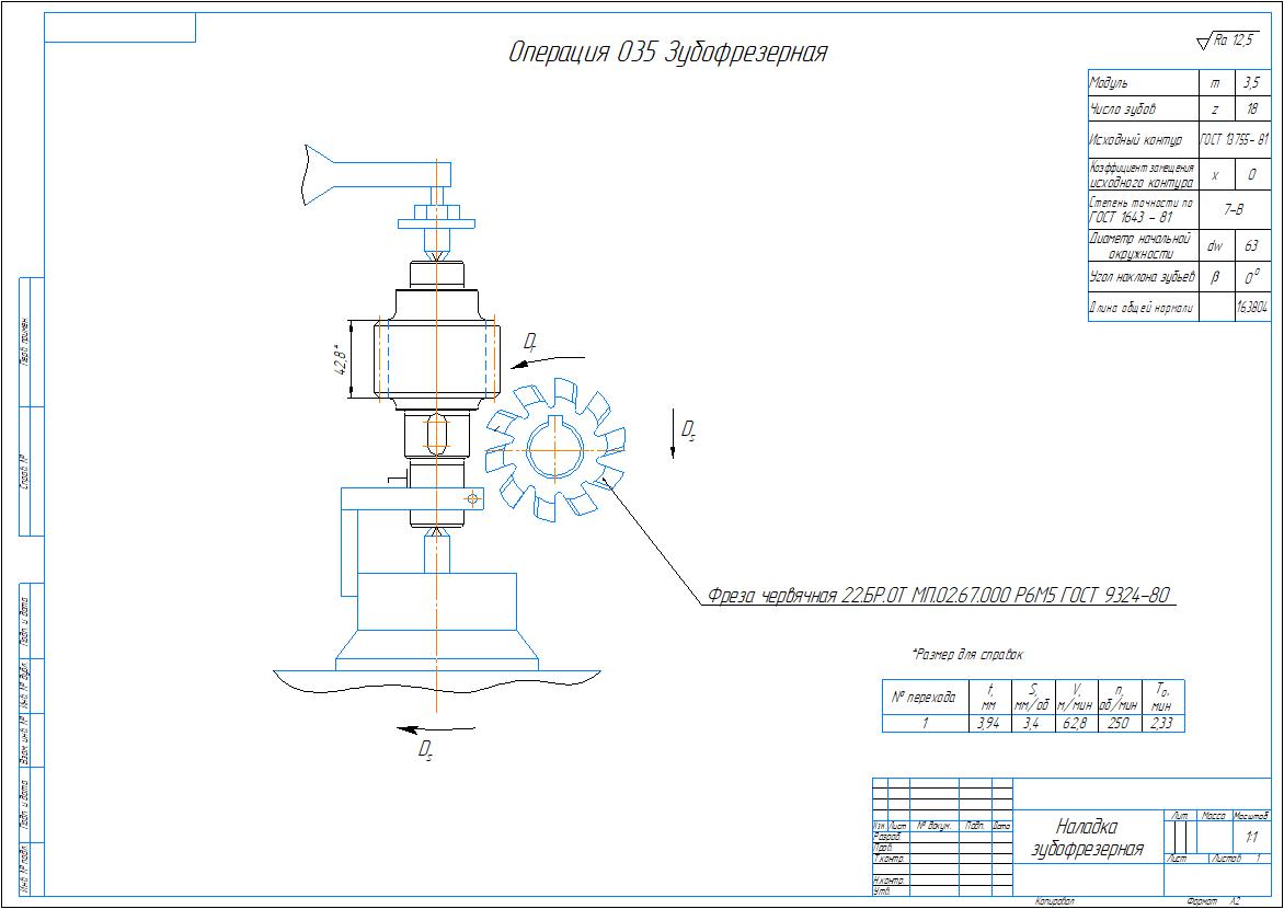 Чертеж наладки зубофрезерной для обработки детали типа вал-шестерня в компасе