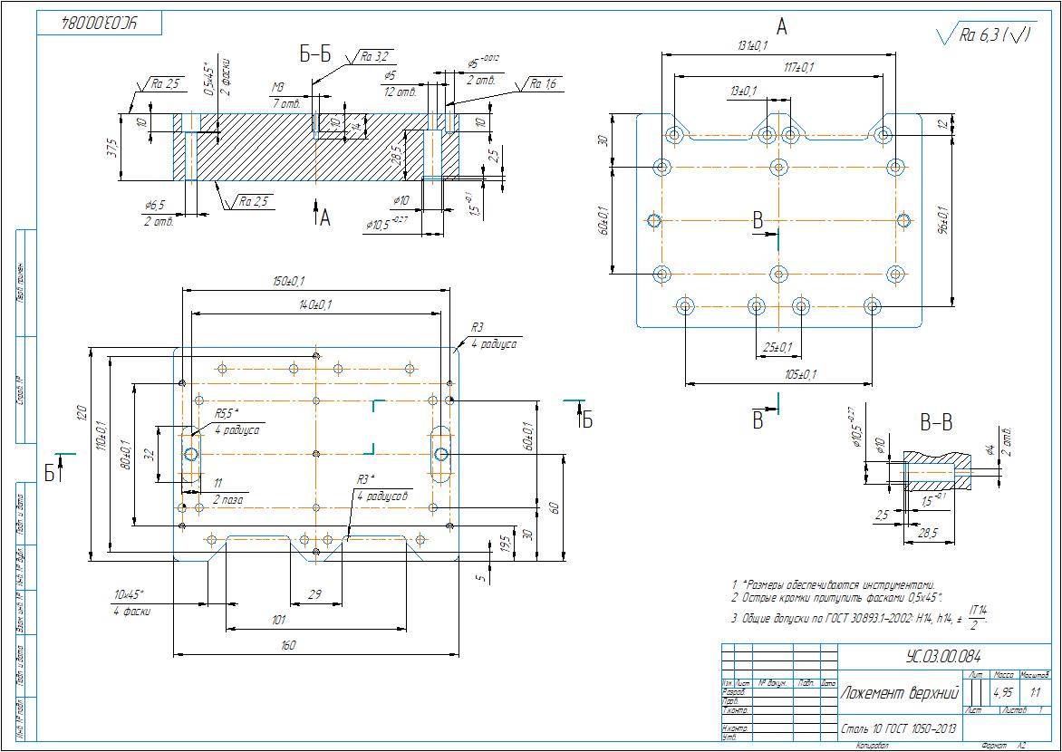 Рабочий чертеж и 3д модель детали ложемент верхний УС.03.00.084 в программе компас. Модель выполнена без дерева построения.