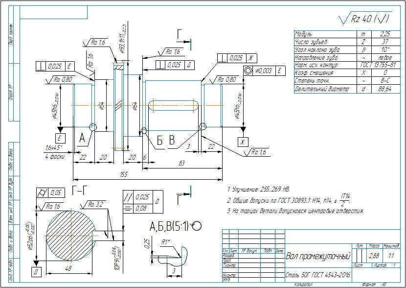 Рабочий чертеж детали вал-шестерня промежуточный с параметрами: модуль m=2,25 мм, число зубьев z=37 шт. Чертеж выполнен в компасе