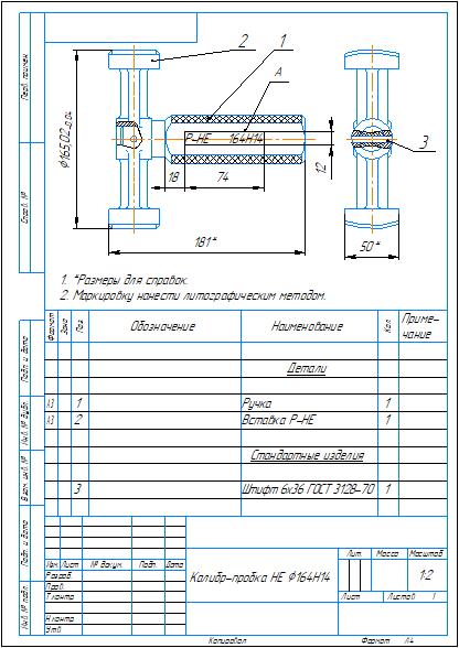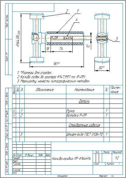 Сборочные чертежи со спецификациями, чертежи деталей калибра-пробки для контроля отверстий диаметром 164H14 мм в компасе. Также приложен расчет калибра-пробки в ворде.