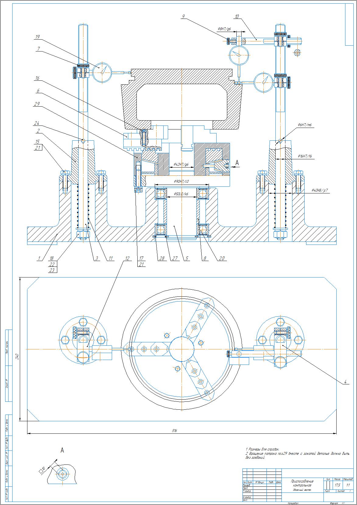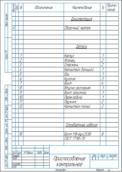 Сборочный чертеж и спецификация контрольно-измерительного приспособления для контроля торцового, радиального биений, а также перпендикулярности. Также приложен рабочий чертеж контролируемой детали. Чертежи и спецификация выполнены в компасе.