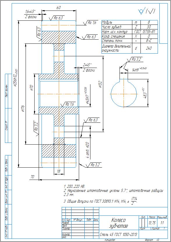 Технологический процесс изготовления детали колесо зубчатое в виде технологических карт: маршрутные, операционные, карты эскизов. Карты выполнены в ворде. Также приложен рабочий чертеж детали колесо зубчатое m=8 мм, z=30 шт.