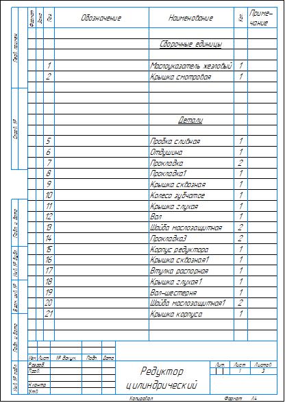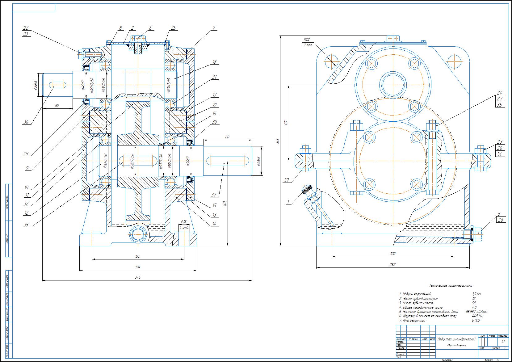 Сборочный чертеж и спецификация редуктора цилиндрического вертикального, модуль m=3,5 мм, межосевое расстояние 125 мм, передаточное число u=4,8. Чертеж и спецификация выполнены в компасе.