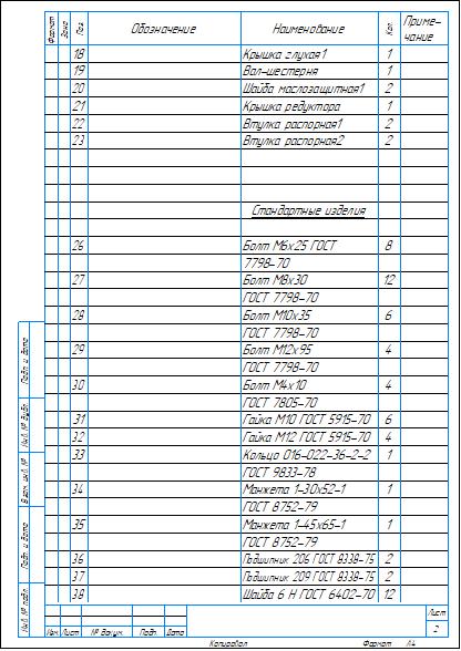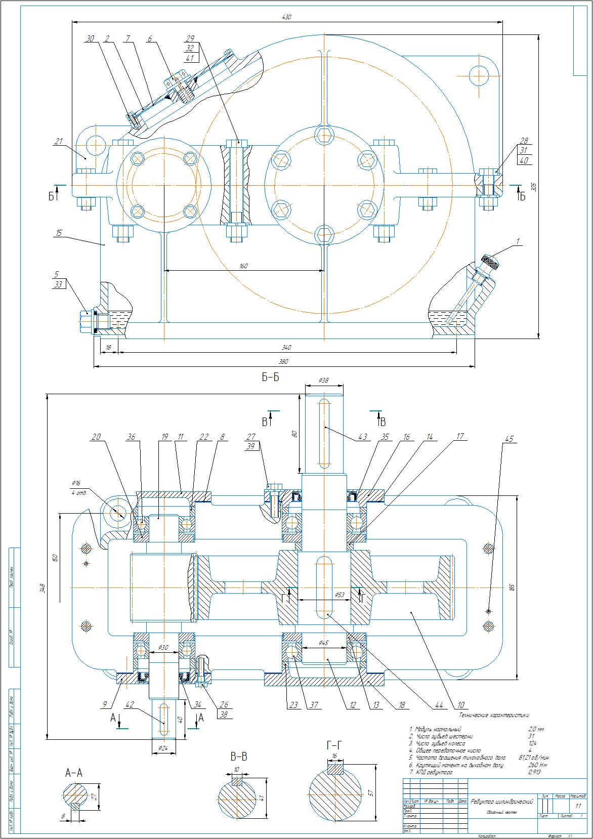 Сборочный чертеж и спецификация редуктора цилиндрического одноступенчатого с параметрами: модуль m=2 мм, межосевое расстояние a=160 мм, передаточное число u=4. Чертеж и спецификация выполнены в компасе.