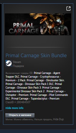 Включенные товары (9): Primal Carnage - Agent Trapper DLC, Primal Carnage - Cryolophosaurus - Premium - 2 Pack, Primal Carnage - Dinobuster Skin, Primal Carnage - Dinosaur Skin Pack 1 DLC, Primal Carnage - Dinosaur Skin Pack 3, Primal Carnage - Experimental Dinosaur Skin Pack 2 , Primal Carnage - Oviraptor - Premium, Primal Carnage - Pilot Commando DLC, Primal Carnage - Tupandactylus - Premium