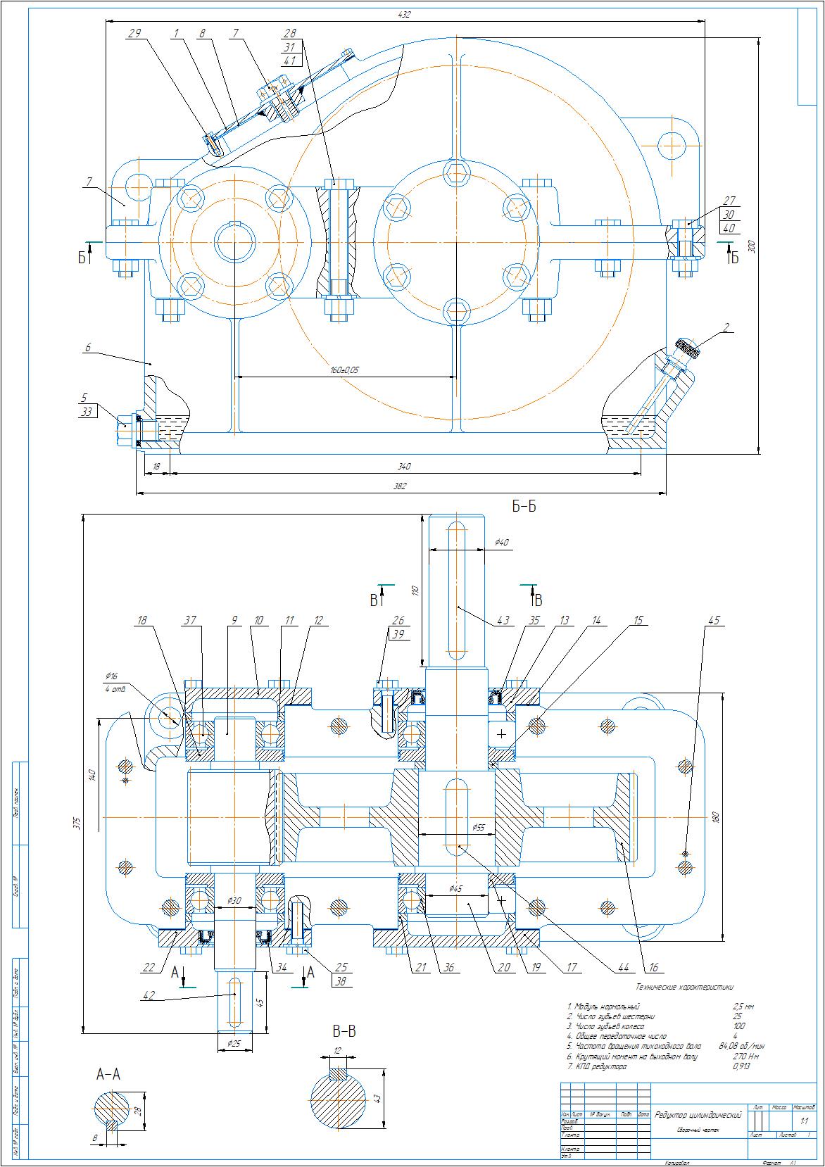 Сборочный чертеж редуктора цилиндрического одноступенчатого с параметрами: модуль m=2,5 мм, межосевое расстояние a=160 мм, передаточное отношение u=4. Чертеж выполнен в компасе.
