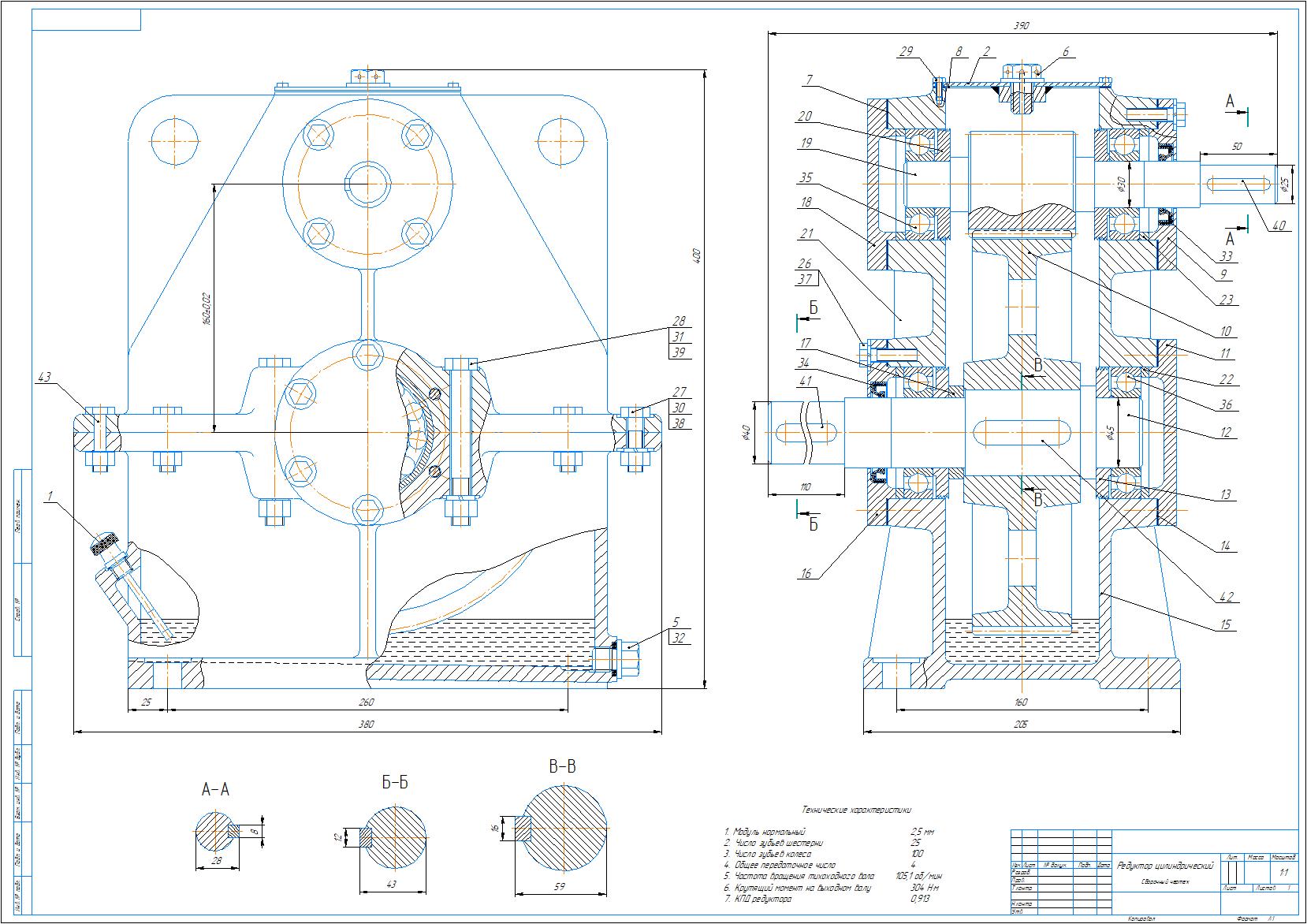 Сборочный чертеж и спецификация редуктора цилиндрического одноступенчатого вертикального с параметрами: модуль m=2,5 мм, передаточное отношение u=4, межосевое расстояние a=160 мм. Чертеж и спецификация выполнены в компасе