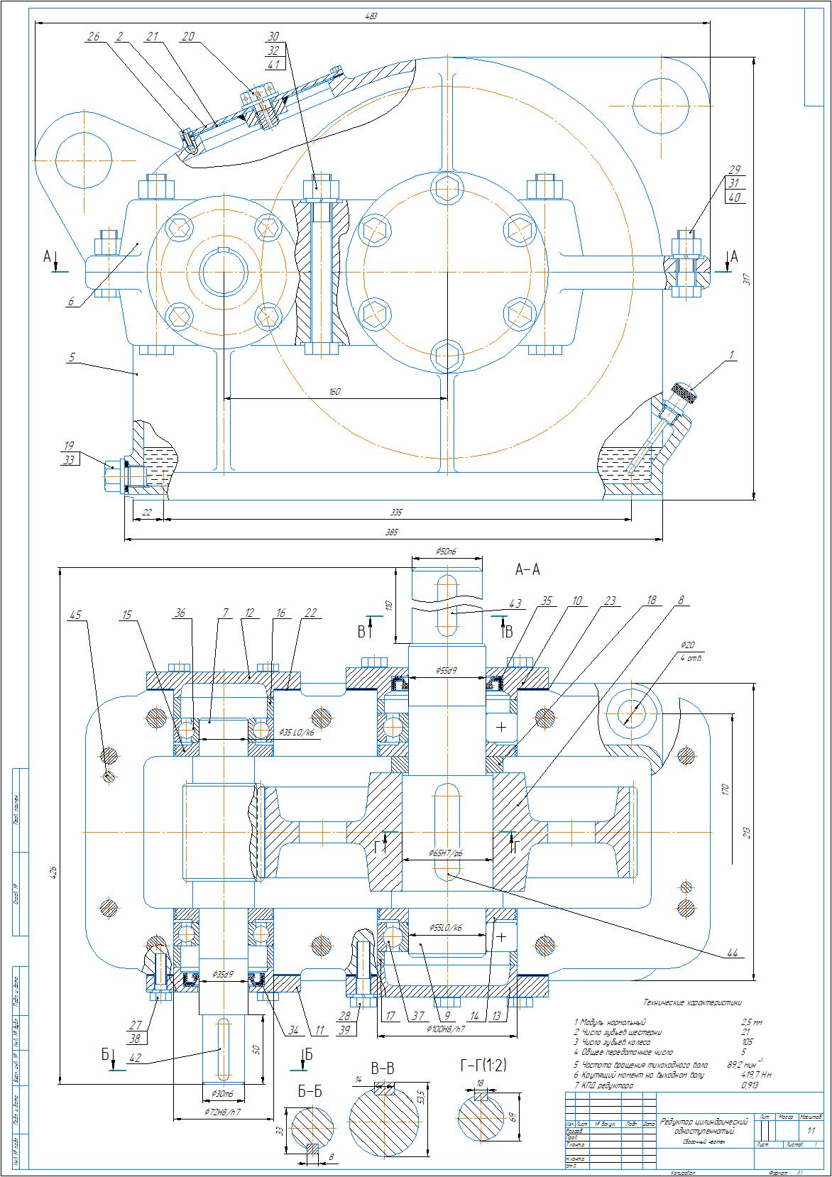 Сборочный чертеж и спецификация редуктора цилиндрического одноступенчатого с параметрами: модуль m=2,5 мм, межосевое расстояние a=160 мм, передаточное отношение u=5. Чертеж и спецификация выполнены в компасе.