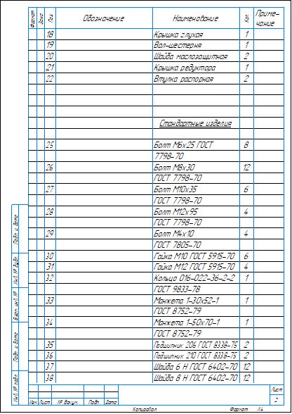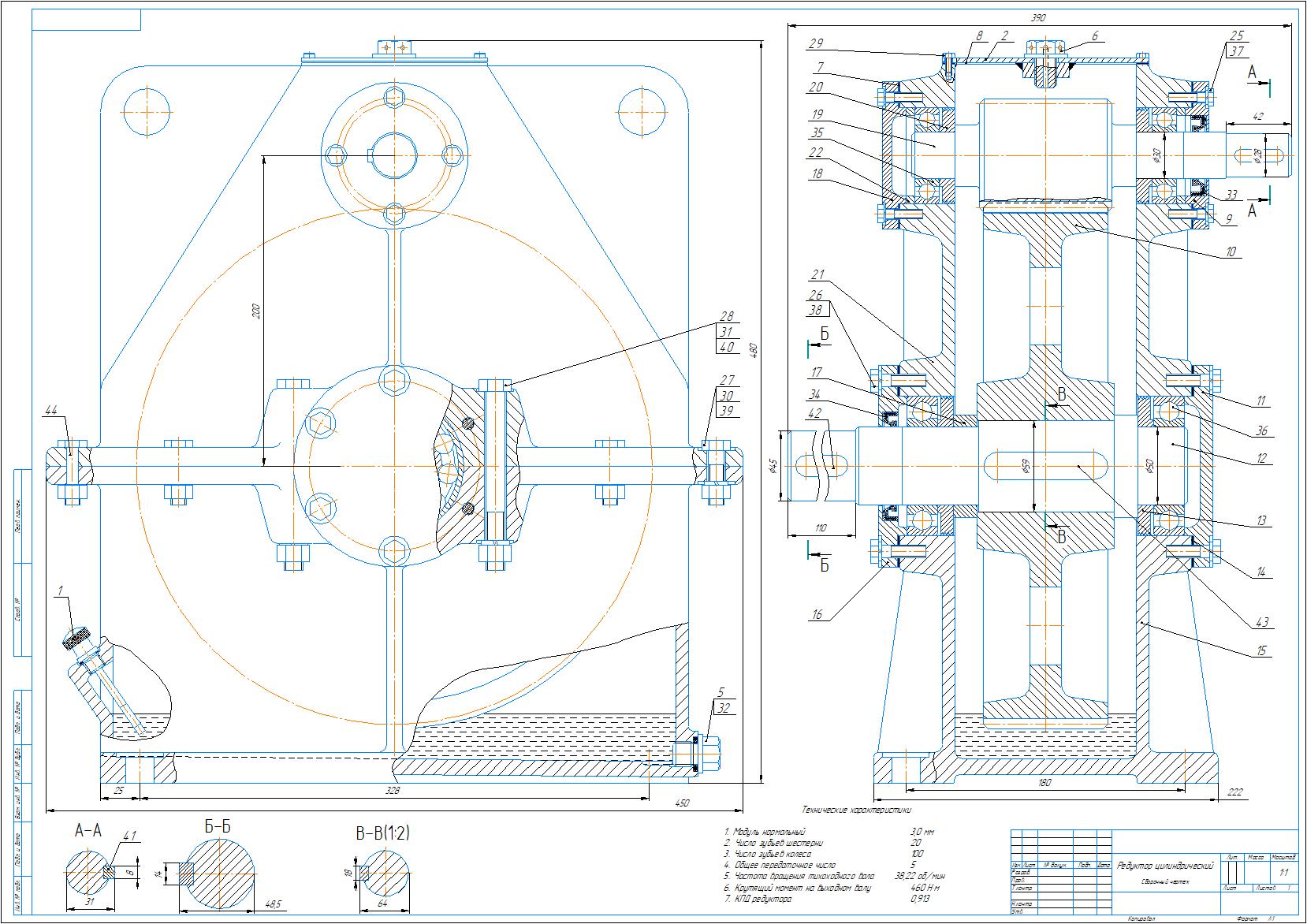 Сборочный чертеж и спецификация редуктора цилиндрического одноступенчатого вертикального с параметрами: модуль m=3 мм, межосевое расстояние a=200 мм, передаточное отношение u=5. Чертеж и спецификация выполнены в компасе.