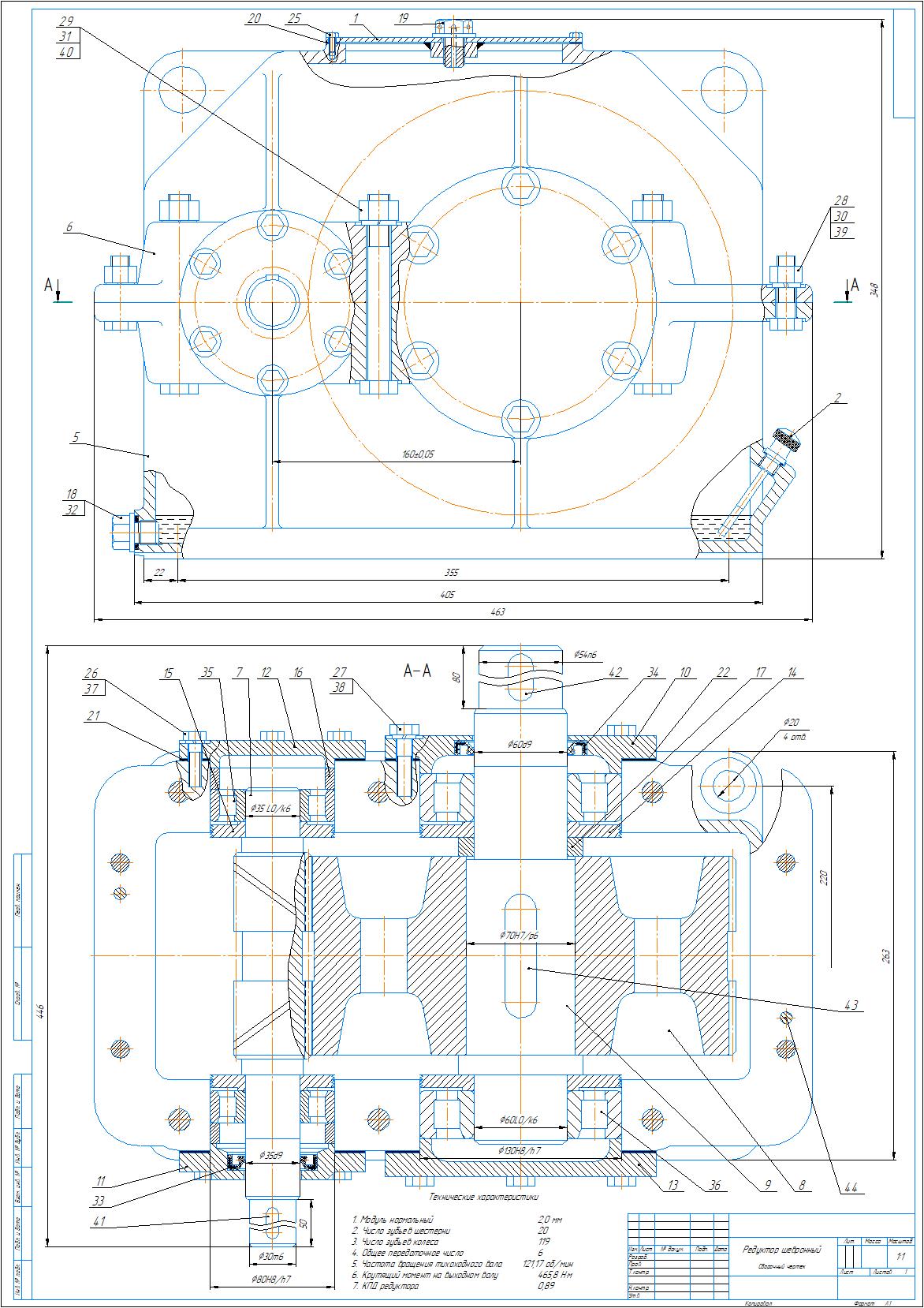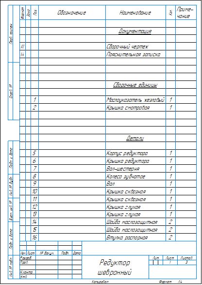 Сборочный чертеж и спецификация редуктора шевронного одноступенчатого с параметрами: модуль m=2 мм, межосевое расстояние a=160 мм, передаточное отношение u=6. Чертеж и спецификация выполнены в Компас 3D