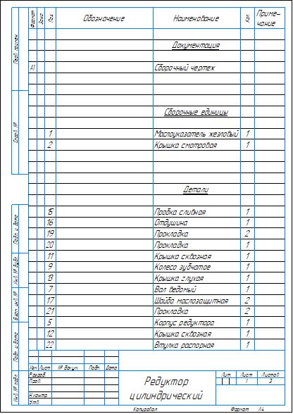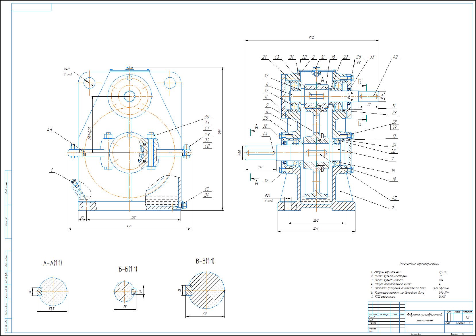 Сборочный чертеж и спецификация редуктора цилиндрического одноступенчатого вертикального с параметрами: модуль m=2,5 мм, межосевое расстояние a=200 мм, передаточное отношение u=4. Чертеж и спецификация выполнены в компасе.