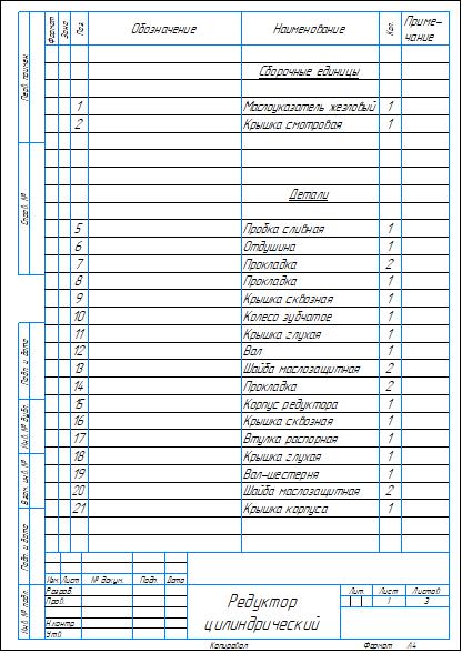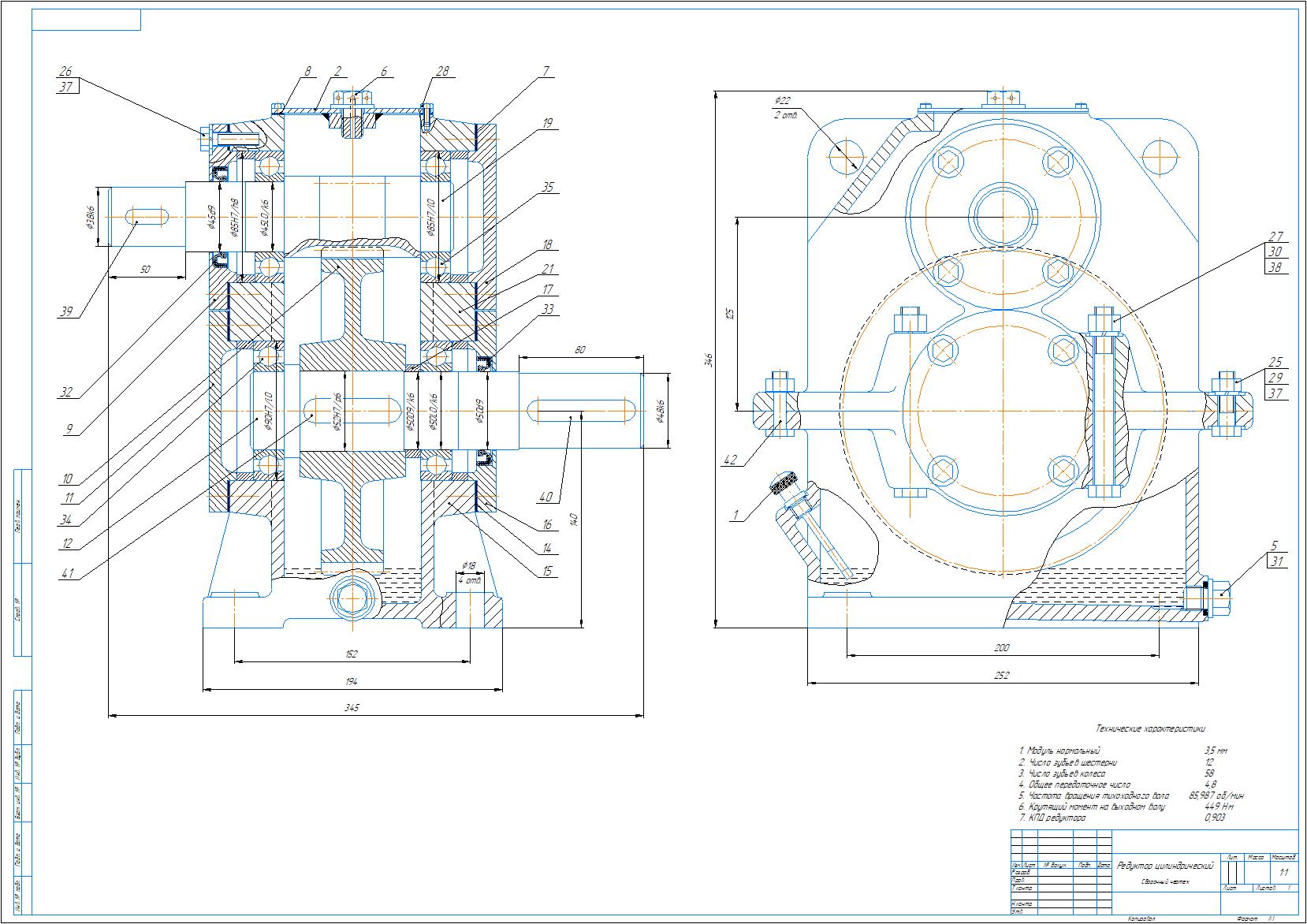 Сборочный чертеж и спецификация редуктора цилиндрического одноступенчатого вертикального с параметрами: модуль m=3,5 мм, межосевое расстояние a=125 мм, передаточное отношение u=4,8. Чертеж и спецификация выполнены в компасе.