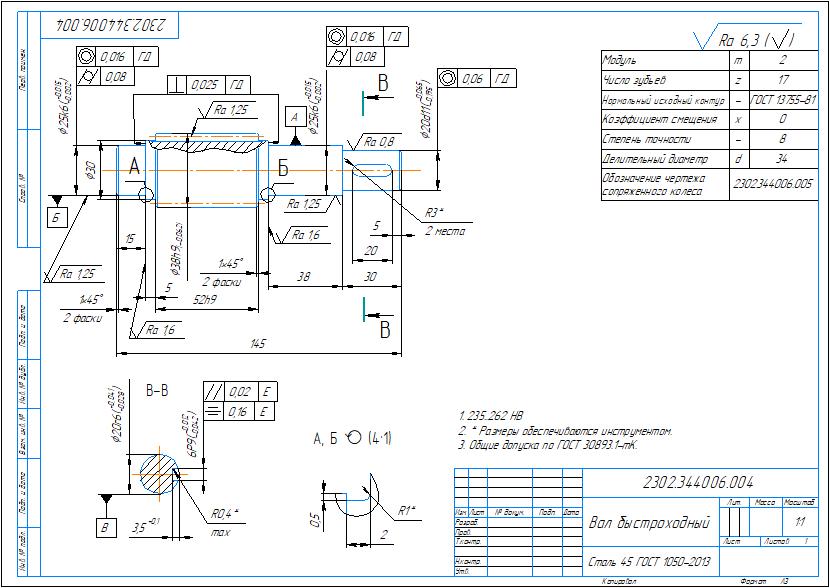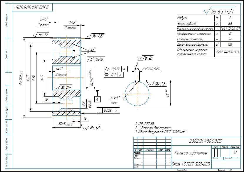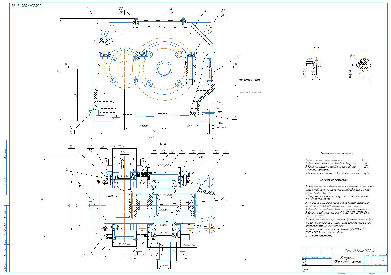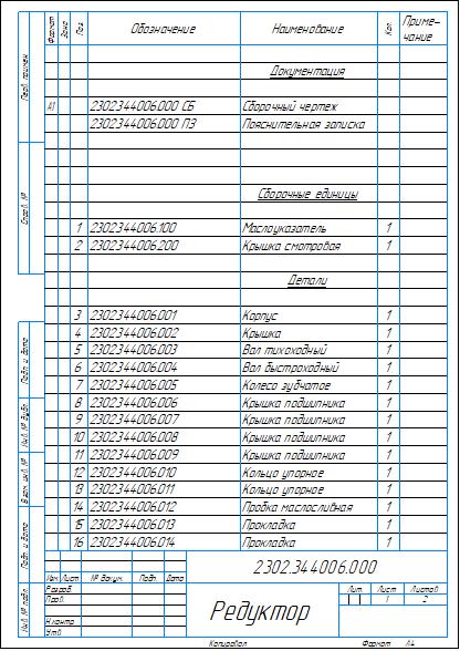 Сборочный чертеж и спецификация редуктора цилиндрического одноступенчатого с параметрами: модуль m=2 мм, межосевое расстояние a=100 мм, передаточное отношение u=4. Также приложены деталировочные чертежи вала и зубчатого колеса. Чертежи и спецификация выполнены в компасе.