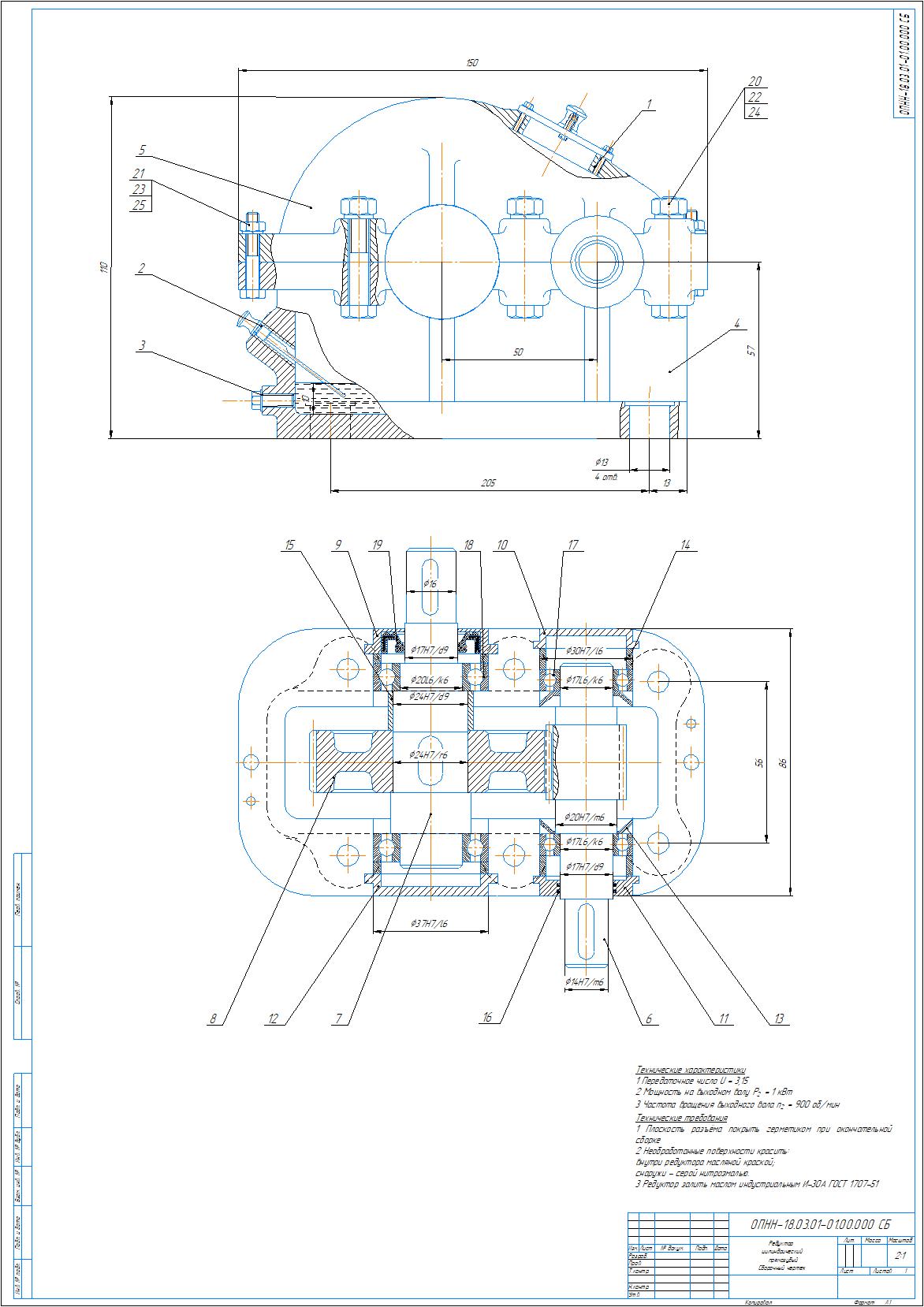 Сборочный чертеж редуктора цилиндрического одноступенчатого горизонтального с параметрами: межосевое расстояние a=50 мм, модуль m=1 мм, передаточное отношение u=3,15. Чертеж выполнен в компасе.