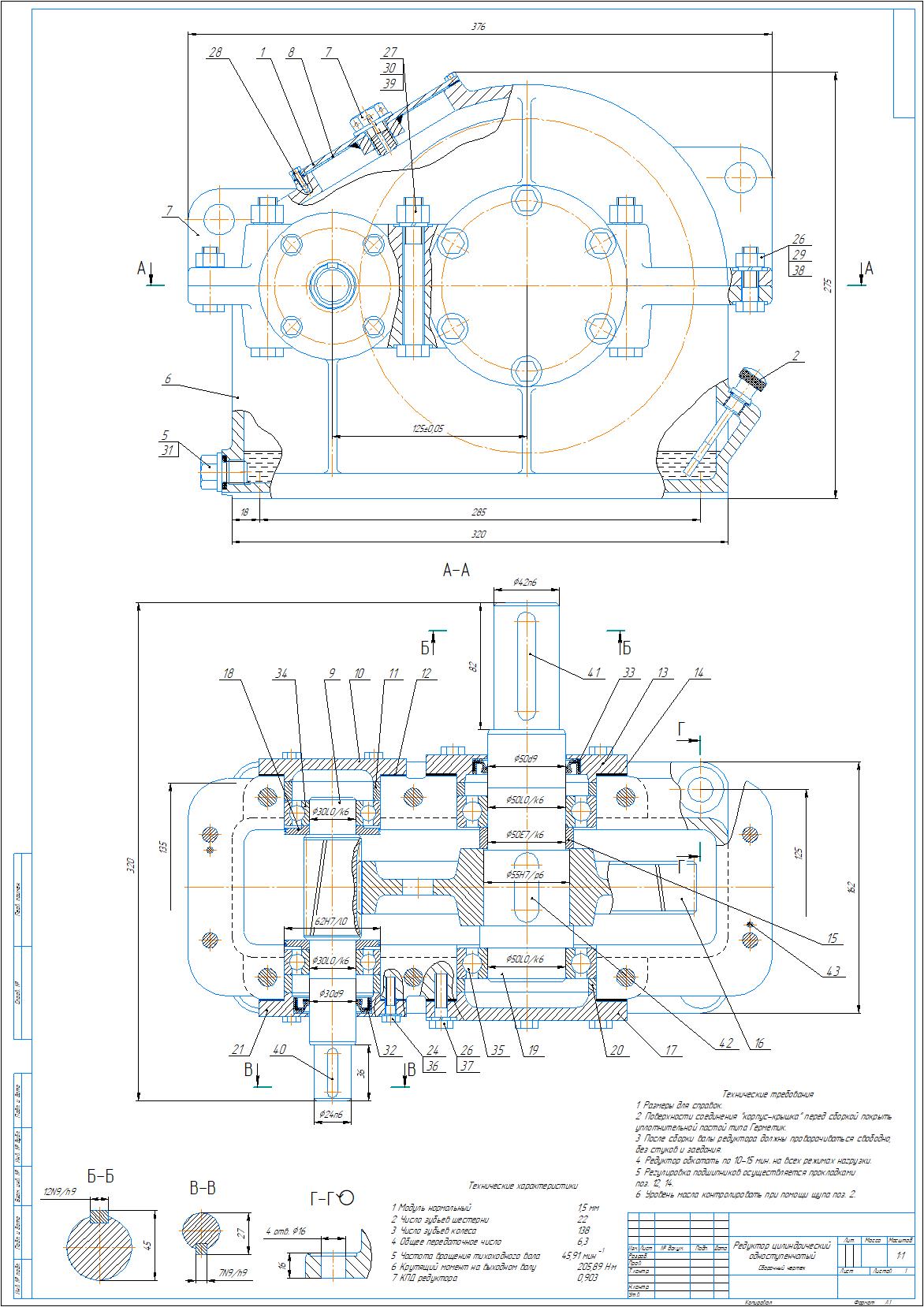 Сборочный чертеж и спецификация редуктора цилиндрического одноступенчатого с параметрами: межосевое расстояние: a=125, модуль m=1,5 мм, передаточное отношение u=6,3. Чертеж и спецификация выполнены в компасе