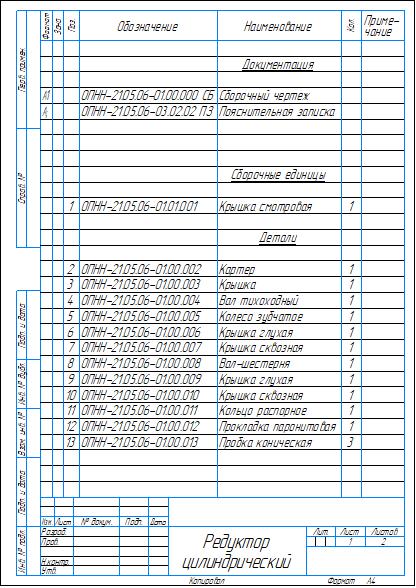 Сборочный чертеж и спецификация редуктора цилиндрического одноступенчатого с параметрами: межосевое расстояние a=63 мм, модуль зацепления m=1,5 мм, передаточное отношение u=4. Также приложены рабочие чертежи вала-шестерни, вала тихоходного, зубчатого колеса и крышки редуктора. Чертежи и спецификация выполнены в компасе