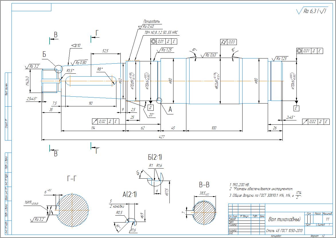 Рабочий чертеж детали вал тихоходный редуктора с посадочным диаметром под подшипники качения - 70 мм. Чертеж выполнен в компасе