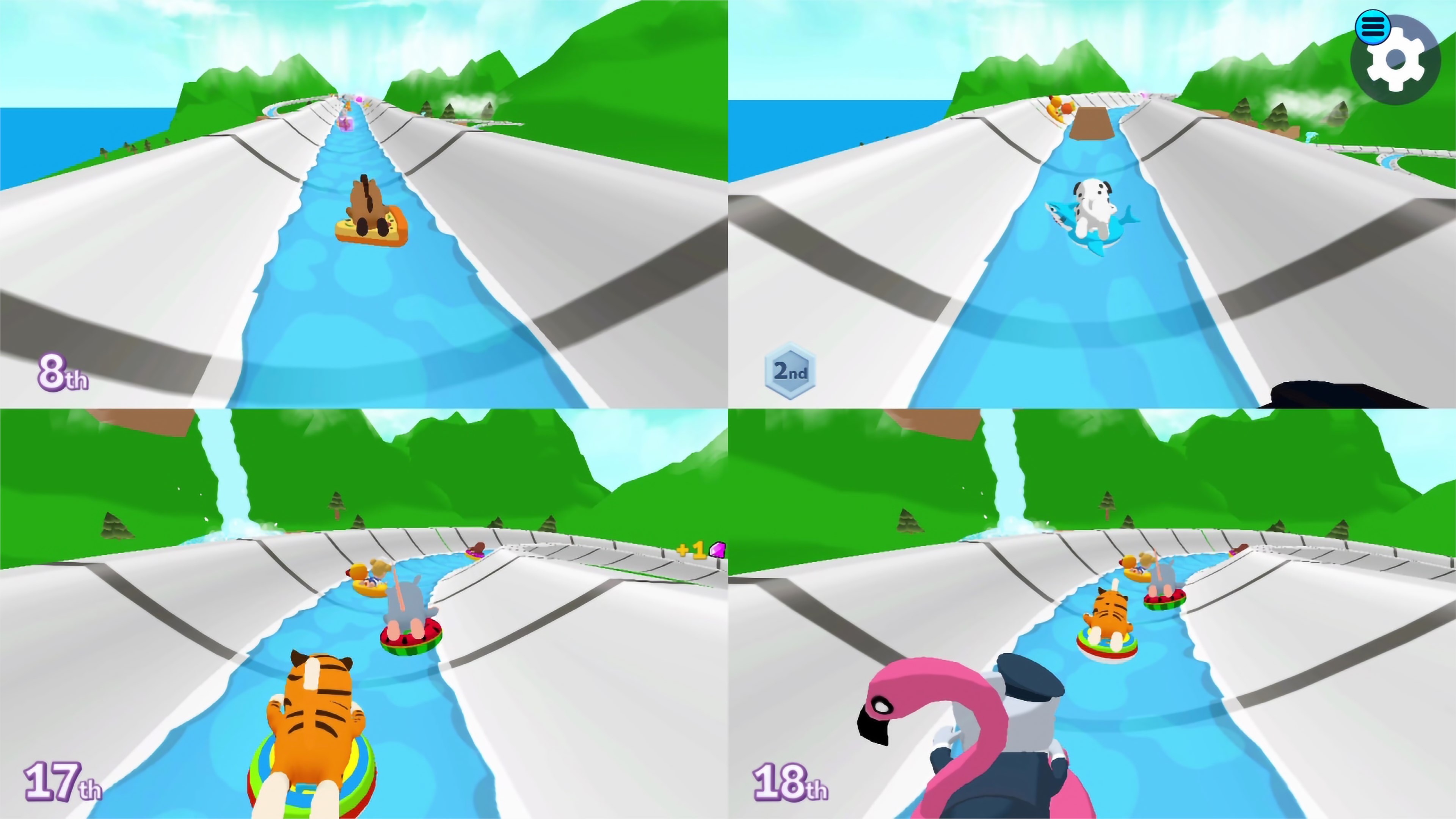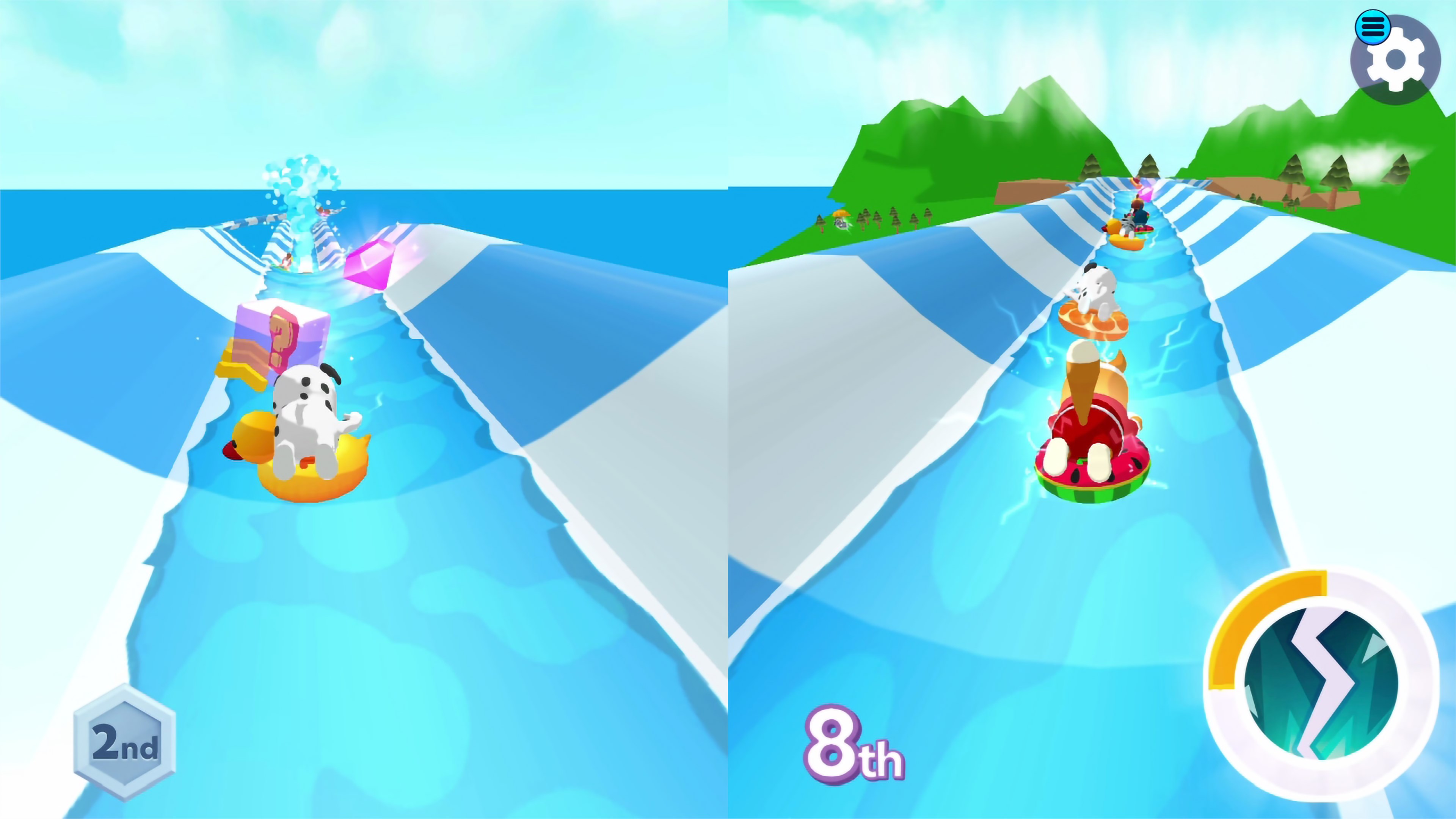 Скатись по огромной водной горке, спиралью спускающейся с небес, обгони друзей, столкни их с трассы или используй усиления, чтобы получить преимущество. Самое забавное — можно в любой момент спрыгнуть с трассы и приземлиться на нижний уровень, мгновенно обогнав всех!