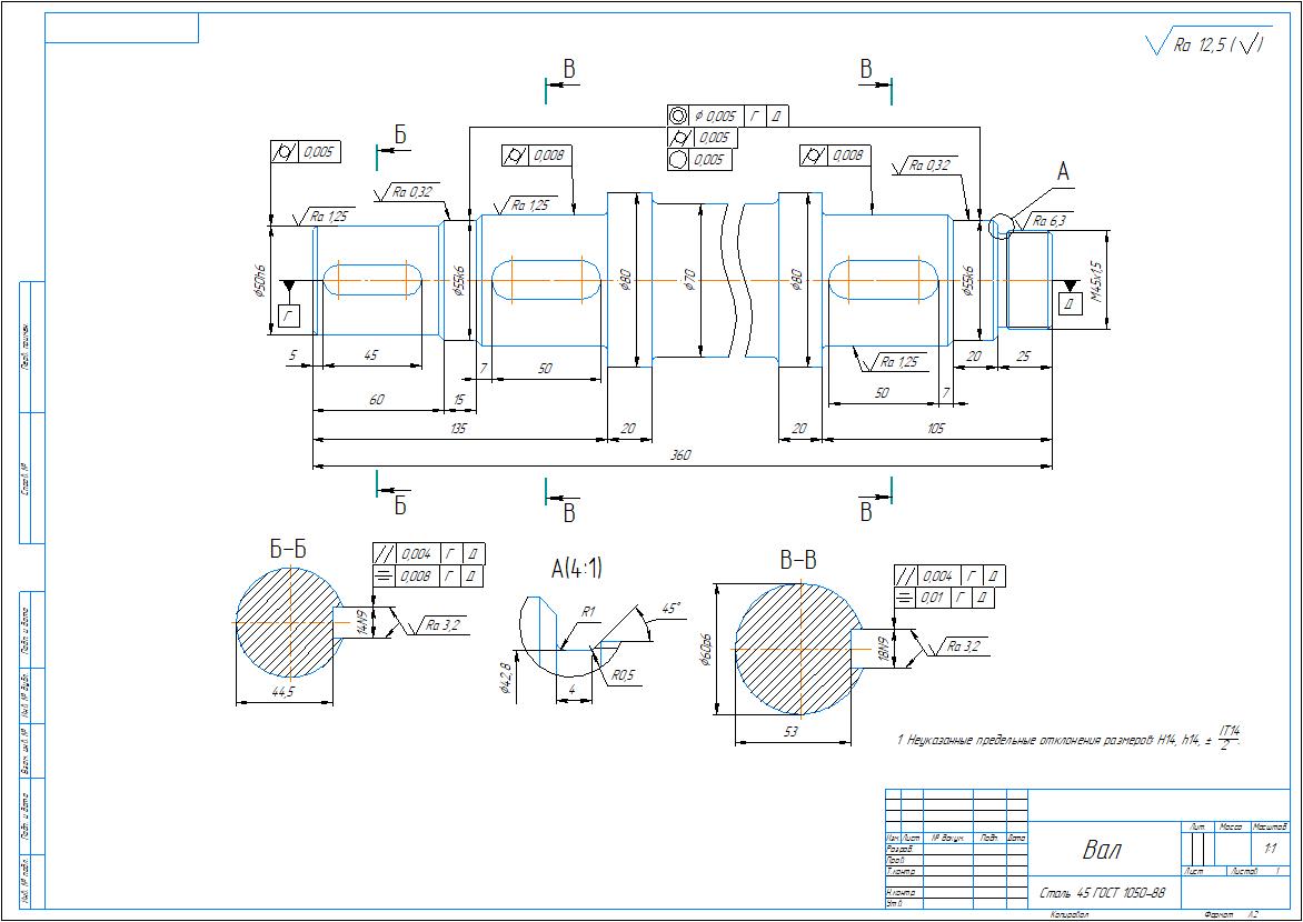 Рабочий чертеж детали вал в программе компас. Диаметр посадочных шеек под подшипники качения - 55 мм.