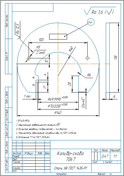 Чертеж калибра-скобы гладкой для контроля размера вала 70k6. Чертеж выполнен в программе Компас 3D. Также приложен расчет калибра-скобы в Word и схема расположения полей допусков калибра в компасе