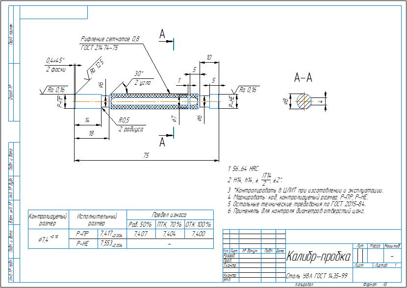 Чертеж калибра-пробки гладкой для контроля отверстия 7,4H12. Чертеж выполнен в программе Компас 3D. Также приложены расчеты размеров калибра-пробки в программе Word.